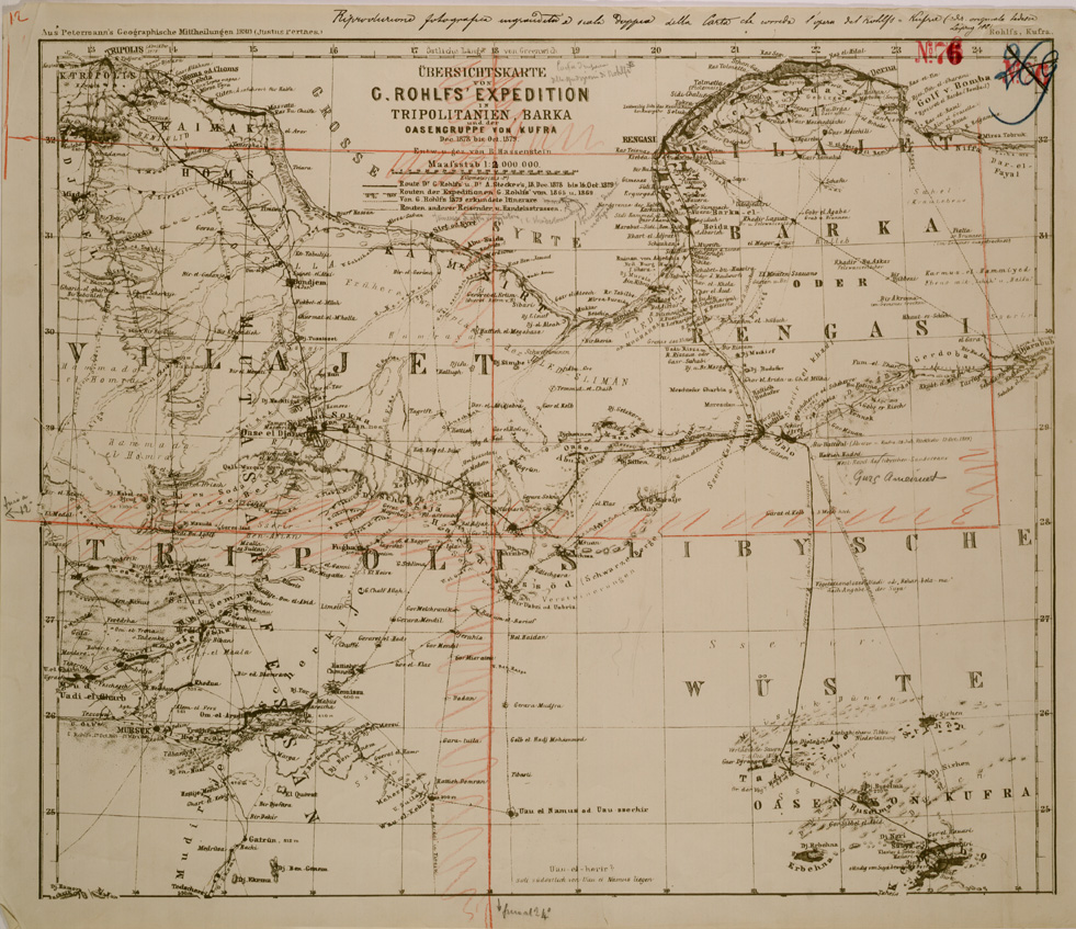 UBERSICHTSKARTE VON C ROHLFS EXPEDITION IN TRIPOLITANIEN, BARKA UND DER OASENGRUPPE VON KUFRA.