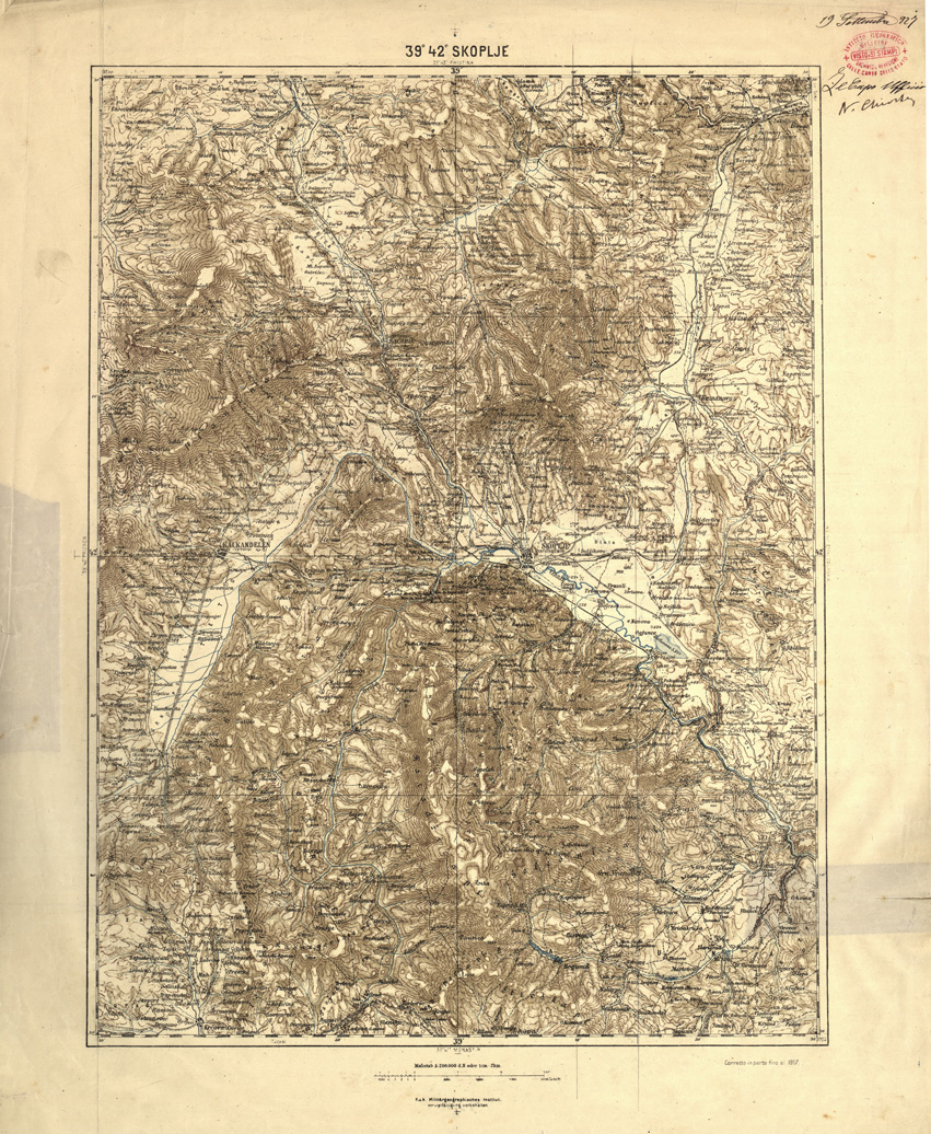 "Carta austriaca, stampa I.G.M. 1927, rappresentazione orografica a sfumo, stampa 5 colori. Allegato inserto di lucidi con aggiornamenti in varie date: ( 1911 1918 1923 ) ed uno di Durazzo allestito nel 1940."