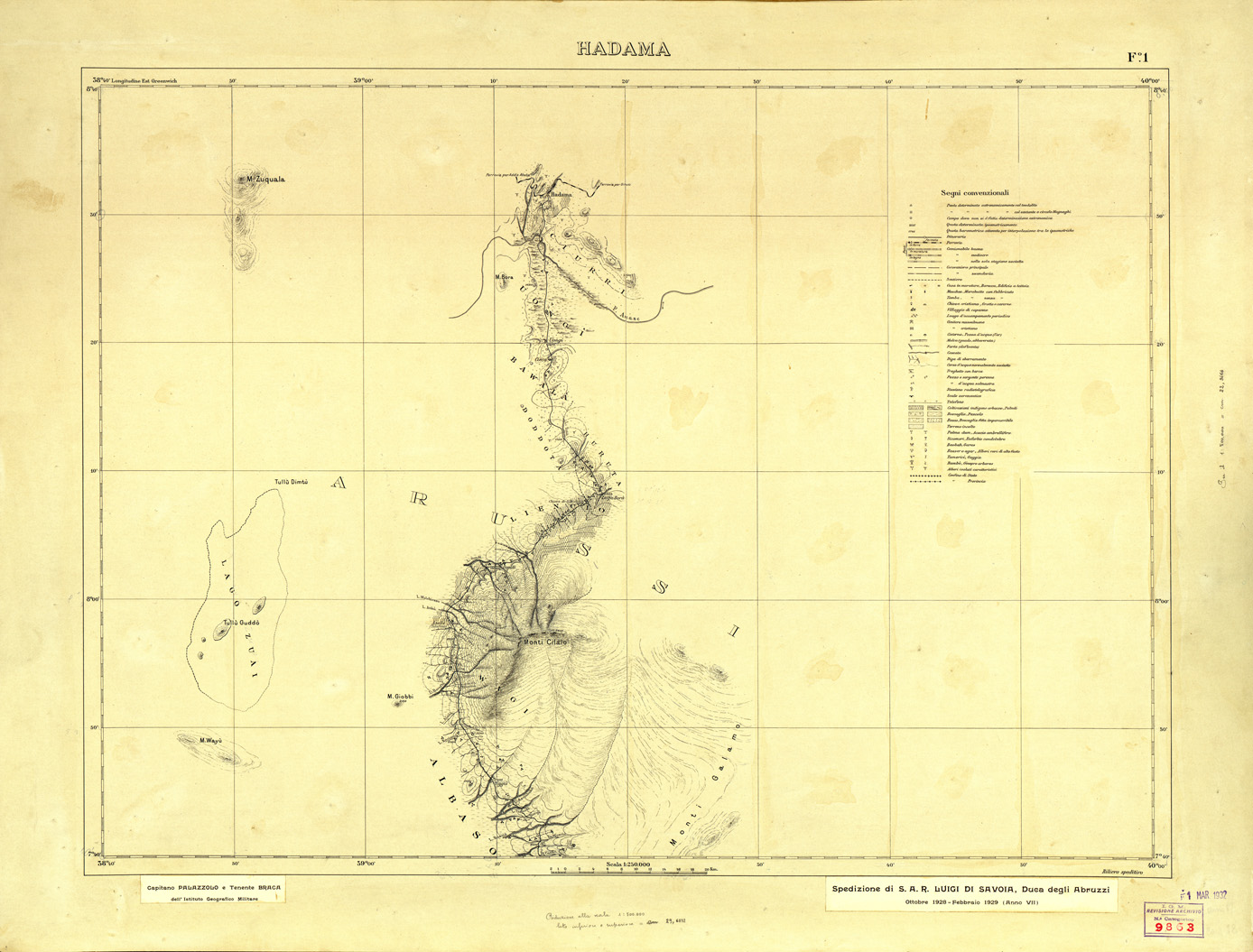 "Carta in 9 fogli di dimensioni varie, i rilievi furono eseguiti dai topografi dell' IGM al seguito della misssione esplorativa di S.A.R. il Duca degli Abruzzi dall' Ottobre 1928 al Febbraio 1929, gli originali furono disegnati alla scala di 1:200.000 per la successiva riproduzione e pubblicazione alla scala di 1:250.000"