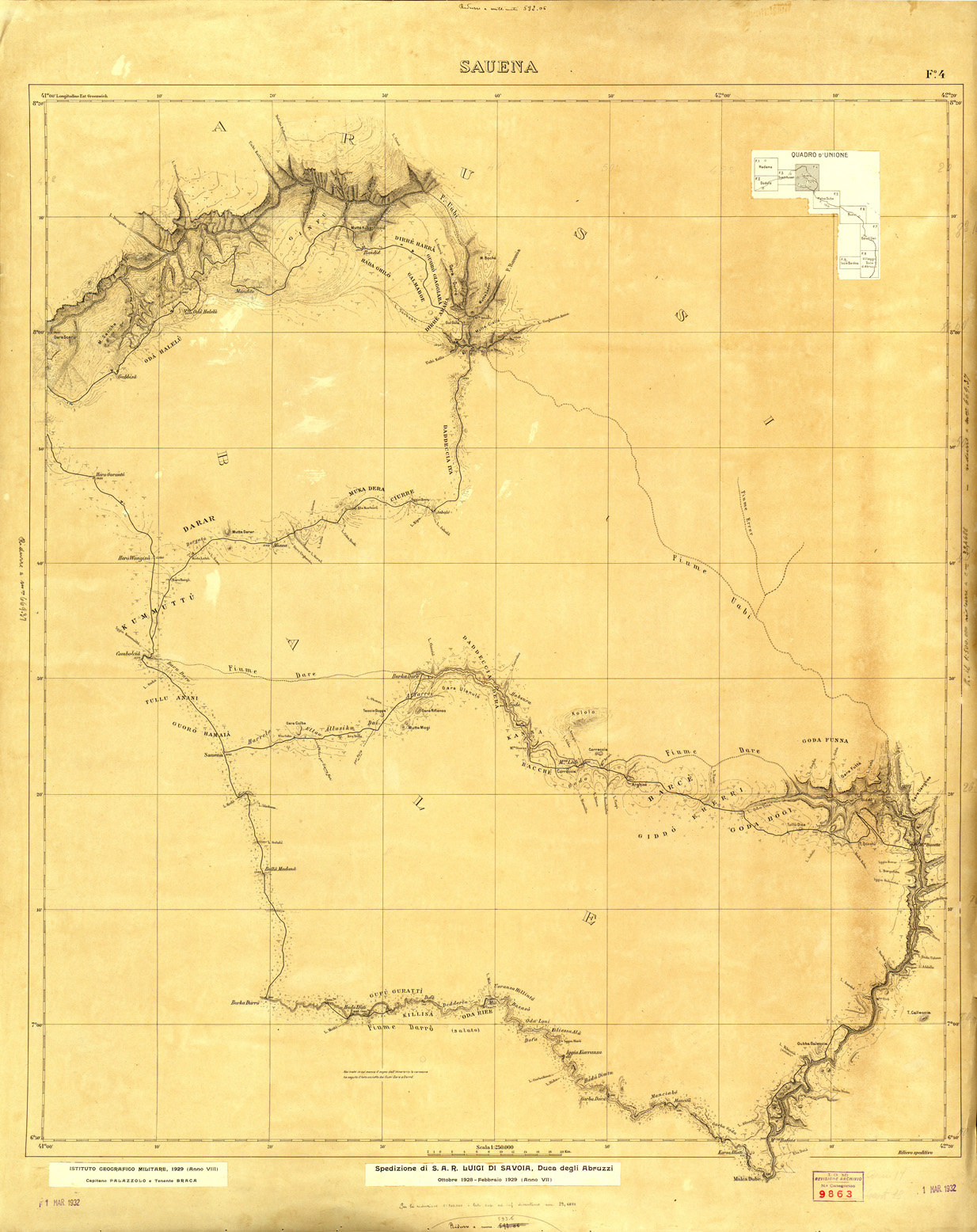 "Carta in 9 fogli di dimensioni varie, i rilievi furono eseguiti dai topografi dell' IGM al seguito della misssione esplorativa di S.A.R. il Duca degli Abruzzi dall' Ottobre 1928 al Febbraio 1929, gli originali furono disegnati alla scala di 1:200.000 per la successiva riproduzione e pubblicazione alla scala di 1:250.000"