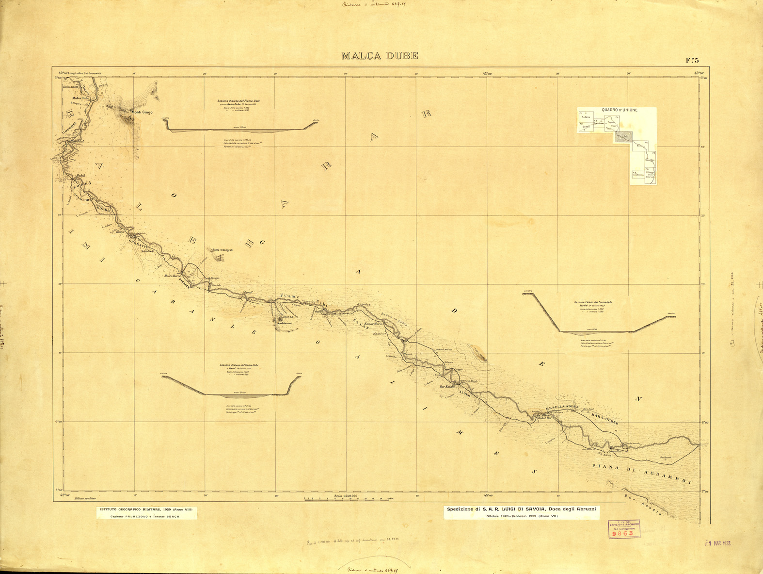 "Carta in 9 fogli di dimensioni varie, i rilievi furono eseguiti dai topografi dell' IGM al seguito della misssione esplorativa di S.A.R. il Duca degli Abruzzi dall' Ottobre 1928 al Febbraio 1929, gli originali furono disegnati alla scala di 1:200.000 per la successiva riproduzione e pubblicazione alla scala di 1:250.000"