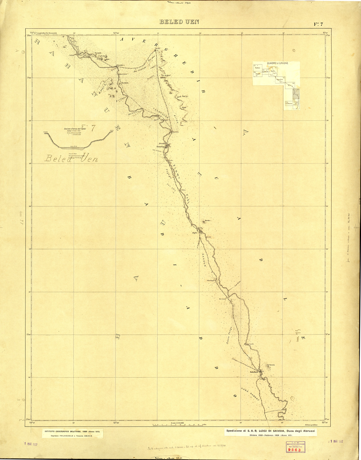 "Carta in 9 fogli di dimensioni varie, i rilievi furono eseguiti dai topografi dell' IGM al seguito della misssione esplorativa di S.A.R. il Duca degli Abruzzi dall' Ottobre 1928 al Febbraio 1929, gli originali furono disegnati alla scala di 1:200.000 per la successiva riproduzione e pubblicazione alla scala di 1:250.000"