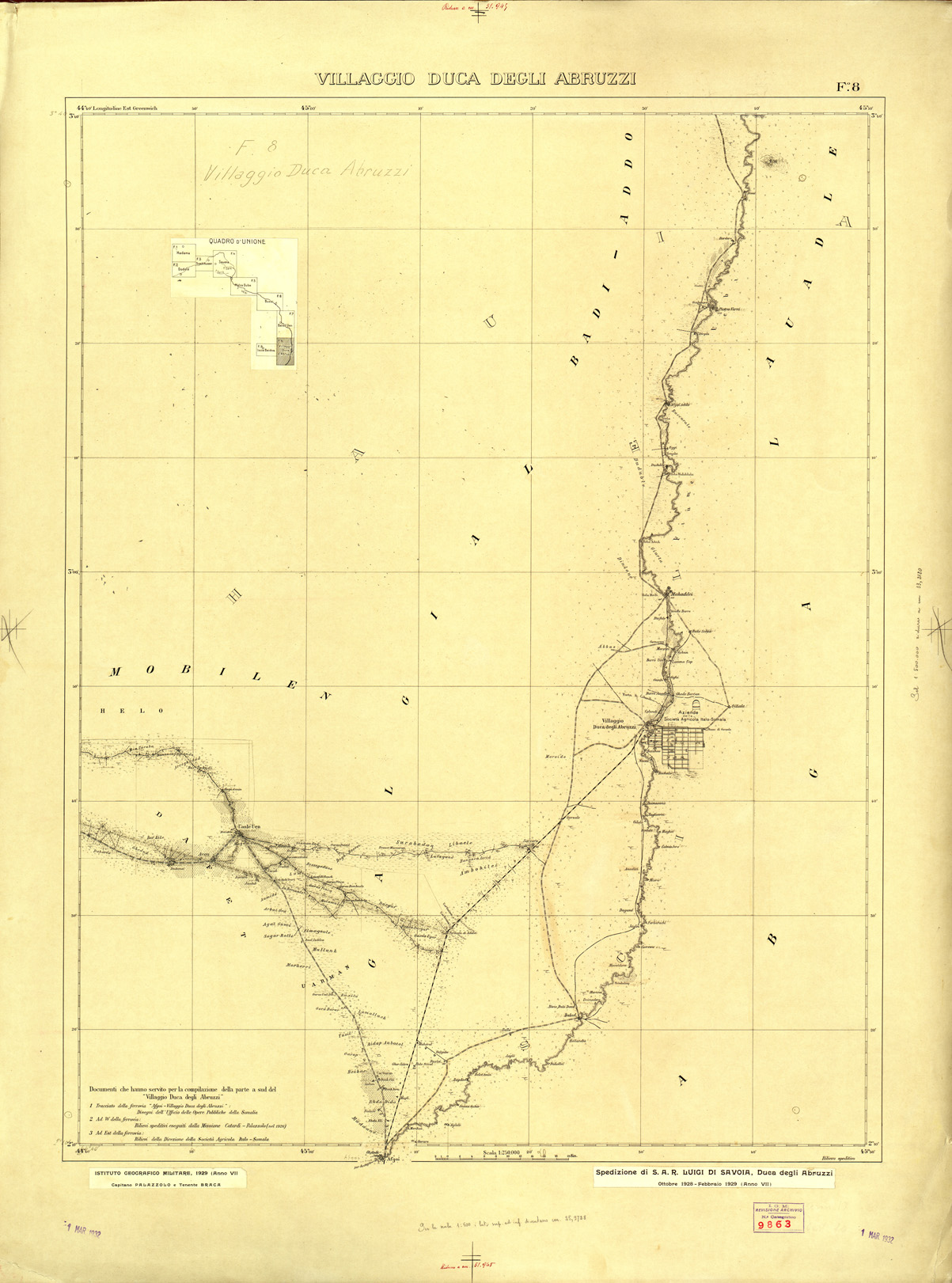 "Carta in 9 fogli di dimensioni varie, i rilievi furono eseguiti dai topografi dell' IGM al seguito della misssione esplorativa di S.A.R. il Duca degli Abruzzi dall' Ottobre 1928 al Febbraio 1929, gli originali furono disegnati alla scala di 1:200.000 per la successiva riproduzione e pubblicazione alla scala di 1:250.000"