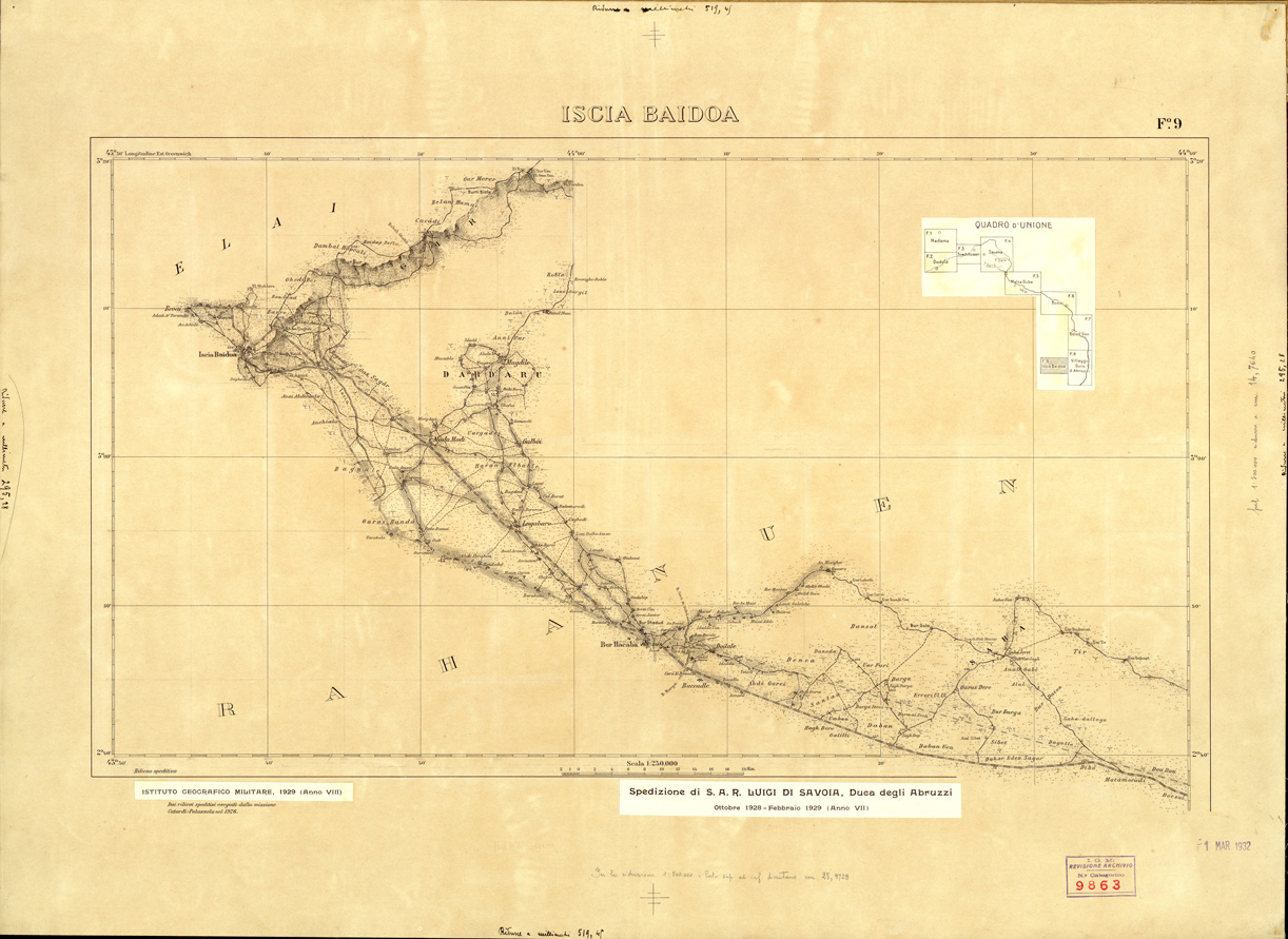 "Carta in 9 fogli di dimensioni varie, i rilievi furono eseguiti dai topografi dell' IGM al seguito della misssione esplorativa di S.A.R. il Duca degli Abruzzi dall' Ottobre 1928 al Febbraio 1929, gli originali furono disegnati alla scala di 1:200.000 per la successiva riproduzione e pubblicazione alla scala di 1:250.000"