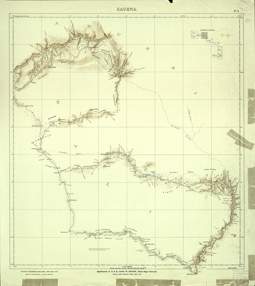 "Carta in 9 fogli di dimensioni varie, i rilievi furono eseguiti dai topografi dell' IGM al seguito della misssione esplorativa di S.A.R. il Duca degli Abruzzi dall' Ottobre 1928 al Febbraio 1929, gli originali furono disegnati alla scala di 1:200.000 per la successiva riproduzione e pubblicazione alla scala di 1:250.000"