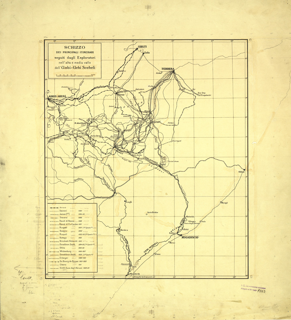 "Schizzo dei principali itinerari seguiti dagli esploratori, indicati in legenda date e autori delle varie spedizioni."