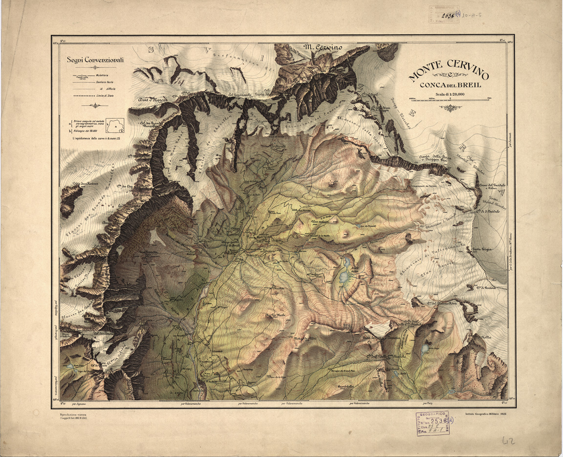 "Bella nitida carta in foglio unico stampato a colori. L'orografia vi è dimostrata a mezzo di curve di livello tracciate in bistro, calcolate alla equidistanza di 25 m., sussidiate da sfumo e tinte ipsometriche e da tratteggio (rocce) acque e ghiacciai in azzurro, abitati, strade, ecc., in nero. Si estende dal M. Cervino (nord) al Gran Collet (sud) e da la Tete des Roèses (ovest) al Passo di Ventina (est). Otto copie, cinque delle quali senza sfumo."