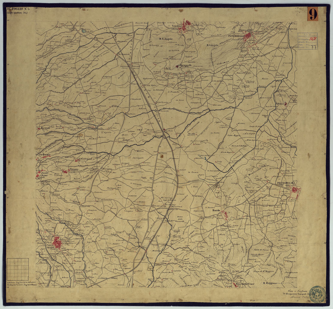 "Sono 167 tavolette montate su tela o seta, copiate e messe in netto all'Officio Topografico di Napoli su le levate eseguite dal 1834 al 1860 per la formazione della Carta del Reame di Napoli alla scala di 1:80.000. L'esecuzione di questa carta venne decretata nel 1814: essa fu però iniziata, dati i movimenti politici di quell'epoca, soltanto nel 1833. Queste tavolette si riferiscono ai fogli 1, 5, 8, 9, 12, 13, 17-19, 28, 29, 33 della suddetta carta la quale doveva essere disegnata ed incisa su rame a bulino in fogli rettangolari con orografia a tratteggio e curve di livello tracciate alla equidistanza di 10 passi (m. 18,52) o di 52 passi (m. 92,60). Di essa peraltro furono pubblicati solamente cinque fogli, cioè: Napoli, Caserta, Gaeta, Leonessa, Cittaducale, tra il 1861 e 1870. L'I.G.M. conserva i rami dei primi tre di questi fogli. La carta all'80.000, pregevolissima per valore artistico e scientifico, venne giudicata superiore alle altre produzioni cartografiche contemporanee non solo italiane, ma europee (cfr. Mori A., La cartografia ufficiale in Italia e l'I.G.M. 1922, pag.107). Le tavolette sono disegnate a colori rosso per gli abitati, azzurro per le acque, verde per le vegetazioni, nero per le curve di livello, rete stradale, toponomastica e il rimanente della planimetria. Rappresentano l'orografia con le curve di livello, sostituite al sistema di tratteggio fino allora seguito, parte tracciate direttamente dagli operatori, parte completate a tavolino in base ai dati raccolti. Le tavolette sono suddivise a gruppi in base al foglio della carta all'80.000 cui si riferiscono ciascun gruppo reca annesso i nomi degli operatori e il visto del topografo capo. Annesso un "Quadro d'unione delle levate alla scala di 1:20.000 eseguite fino a tutto il 1860 dal R. Officio Topografico Napoletano" alla scala di 1:490.700, stampato nel 1884. Il documento è ripartito in Cart. d'Arch. n°75 (che comprende 52 fogli), n° 76 (48 fogli), n° 77 (44 fogli)."