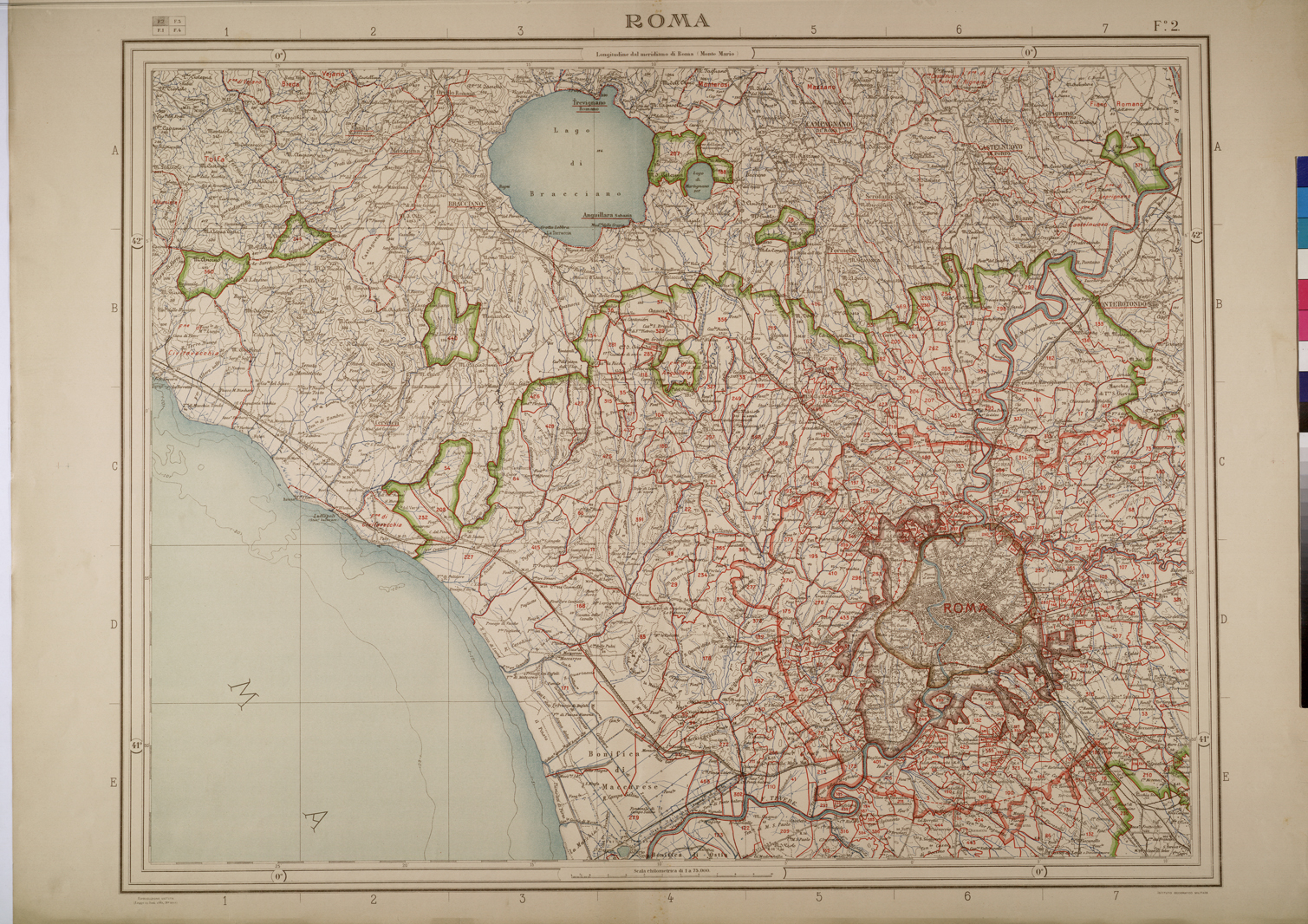 CARTA DELL'AGRO ROMANO IN QUATTRO FOGLI COI CONFINI DELLE TENUTE E DEI TERRITORI COMUNALI LIMITROFI ALLA SCALA DI 1:75,000 DELINEATA SULLE CARTE DELL'ISTITUTO GEOGRAFICO MILITARE DAL CAV. AGR. POMPEO SPINETTI - FOGLIO 2.