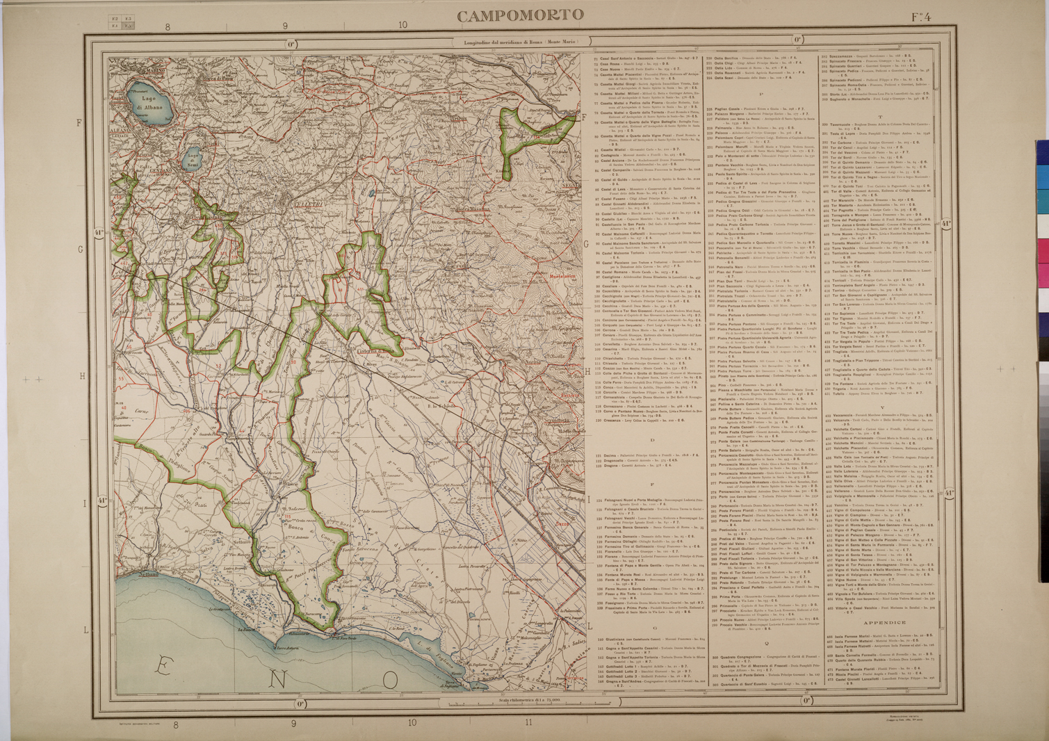 CARTA DELL'AGRO ROMANO IN QUATTRO FOGLI COI CONFINI DELLE TENUTE E DEI TERRITORI COMUNALI LIMITROFI ALLA SCALA DI 1:75,000 DELINEATA SULLE CARTE DELL'ISTITUTO GEOGRAFICO MILITARE DAL CAV. AGR. POMPEO SPINETTI - FOGLIO 4.