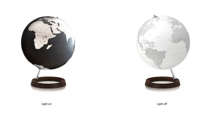 Globo illuminato. Base in frassino e alluminio. Cartografia bianca e grigia con codici telefonici internazionali e codici Internet. Designed by Atmosphere.