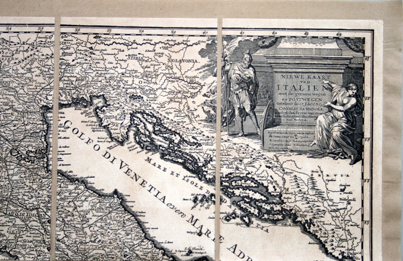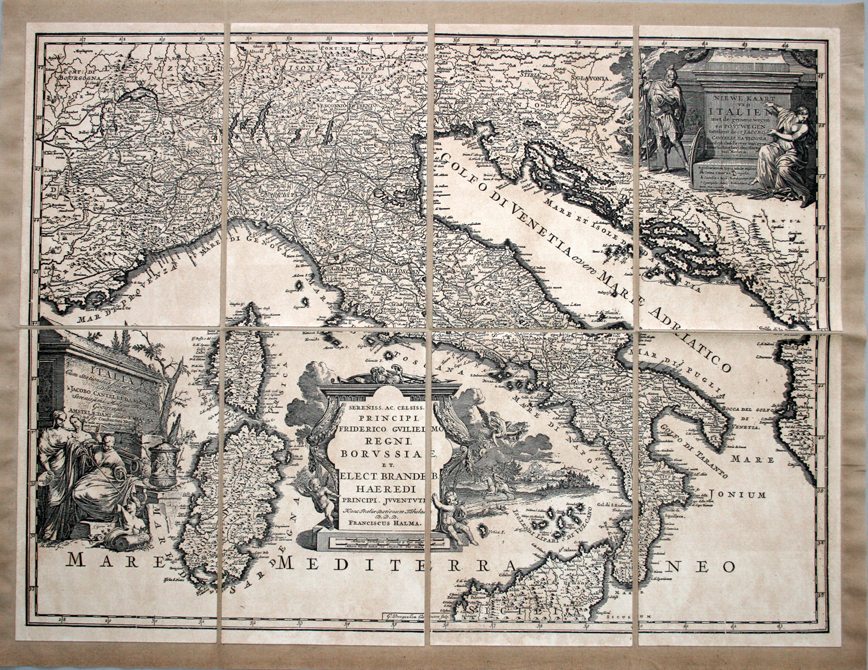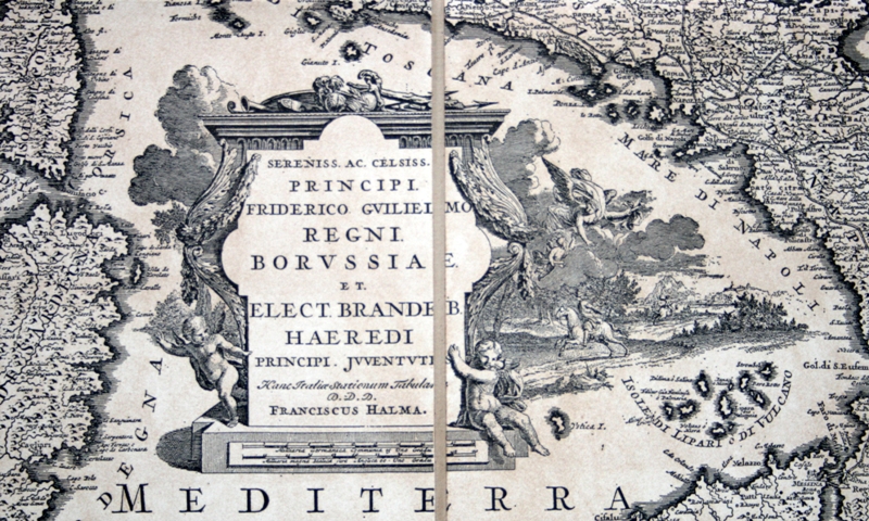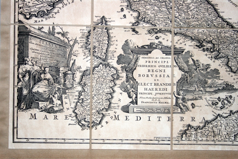 "Un’edizione particolarmente interessante che proponiamo è quest’Italia del Cantelli Da Vignola, edita da Francesco Halma in Amsterdam e dedicata al Principe Federico Guglielmo, Duca di Modena. Dotata di due titoli (tedesco e latino), questa rappresentazione cartografica ha un’orientazione normale. Le longitudini provengono dalle isole di Capo Verde e l’orografia è prospettica. Le strade sono rappresentate con due linee parallele. Questa carta, in analogia con le tecniche costruttive di un tempo, è costituita da più fogli (di carta di cotone) montati 'a stacchi' su tela. Tutto ciò al fine di migliorarne la conservazione, agevolarne la leggibilità e facilitarne il trasporto. I singoli fogli sono realizzati mediante l'incisione al torchio manuale della matrice in rame; questa pregevole realizzazione conferisce al disegno il caratteristico 'solco' percepibile al tatto."