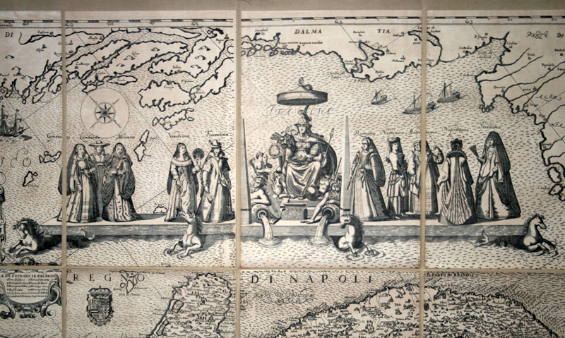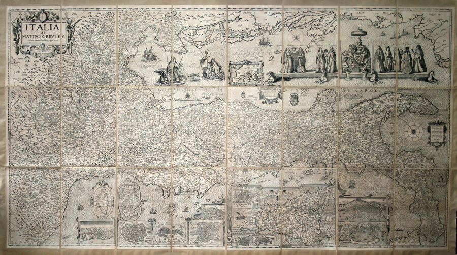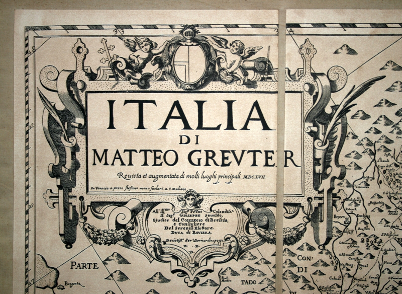 "L’Italia proposta, edizione veneta del 1657, è di dimensioni piuttosto ragguardevoli, con una scala approssimativa di 1: 540.000. Composta di 12 fogli, ha le longitudini provenienti dalle isole di Capo Verde. La toponomastica è in italiano e contiene figure allegoriche delle varie regioni e piante prospettiche di alcune città. Le tre isole maggiori, Sicilia, Sardegna e Corsica, sono inquadrate a parte. Un aspetto curioso di questa mappa sta nella disposizione data dal Greuter dell’Italia, posizionata orizzontalmente. Il motivo è spiegato in un apposito cartiglio nella carta stessa. Questa carta, in analogia con le tecniche costruttive di un tempo, è costituita da più fogli (di carta di cotone) montati 'a stacchi' su tela. Tutto ciò al fine di migliorarne la conservazione, agevolarne la leggibilità e facilitarne il trasporto. I singoli fogli sono realizzati mediante l'incisione al torchio manuale della matrice in rame; questa pregevole realizzazione conferisce al disegno il caratteristico 'solco' percepibile al tatto."