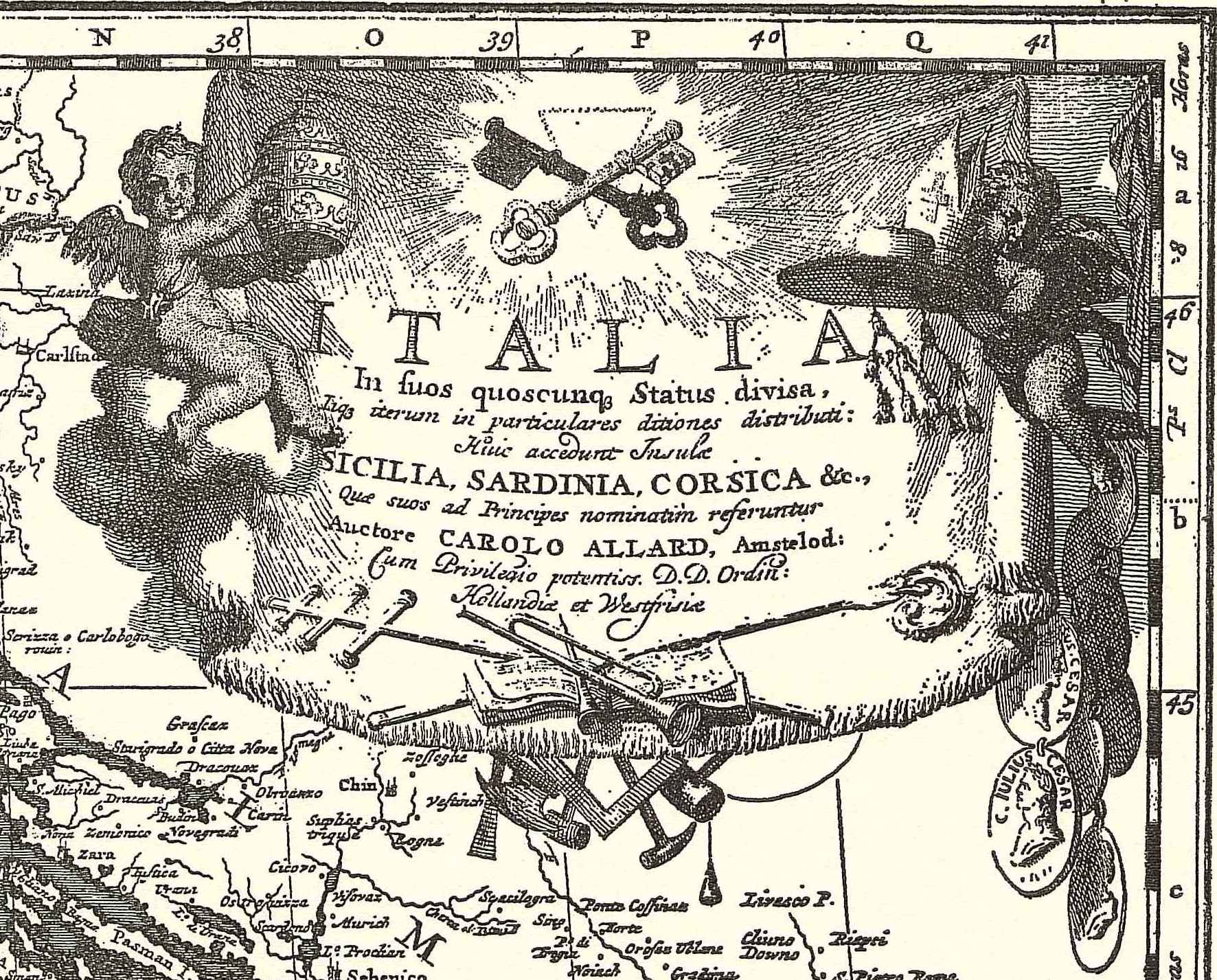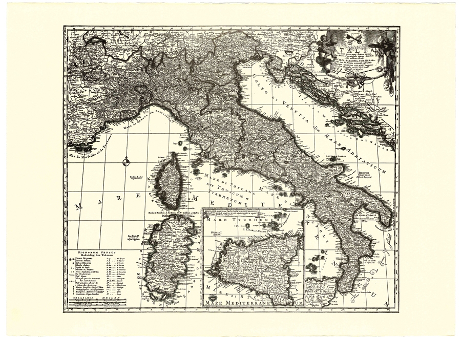 Italia in suos quoscunq status divisa, Allard, 1705 (incisione, B/N) - riproduzione di carta antica