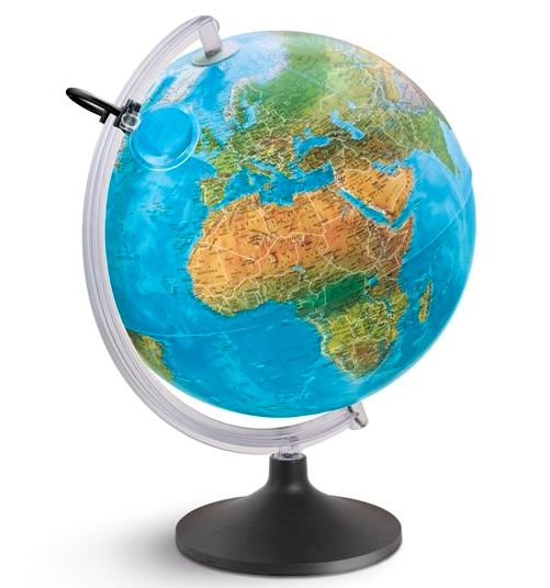 "Globo illuminato. Doppio effetto (fisico / politico illumitato). Le capitali ed i confini degli stati sono evidenziate con un segnale luminoso. Base color nero e semimeridiano in resina trasparente. Lente d'ingrandimento inclusa. "