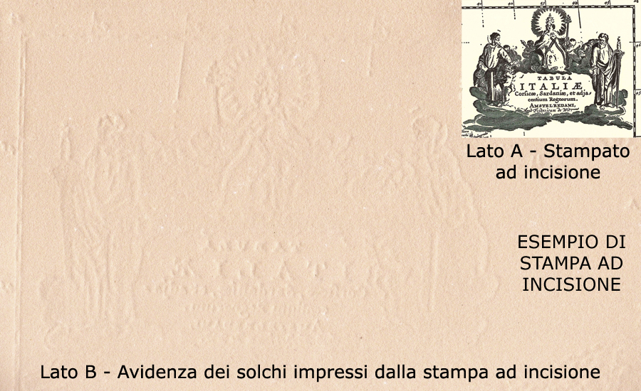 La carta è realizzata con la tecnica della stampa ad incisione al torchio manuale. Il profilo della cartografia, disegnato su una lastra di rame che costituisce la matrice, viene così inciso su un foglio di carta di puro cotone color avorio. Il processo di incisione imprime alla stampa il caratteristico solco che, oltre ad essere rilevabile a tatto, rende particolarmente gradevole la visione per l'effetto ottico generato della luce riflessa. Nella quinta immagine di dettaglio è possibile osservare l'effetto tipico della stampa ad incisione.