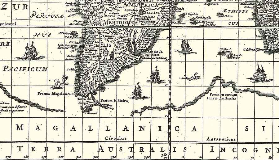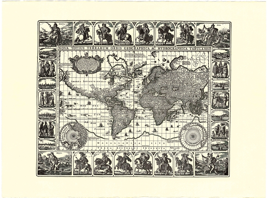 Mondo nova totius terrarum orbis, Piscator, 1656 (incisione, B/N) - riproduzione di carta antica
