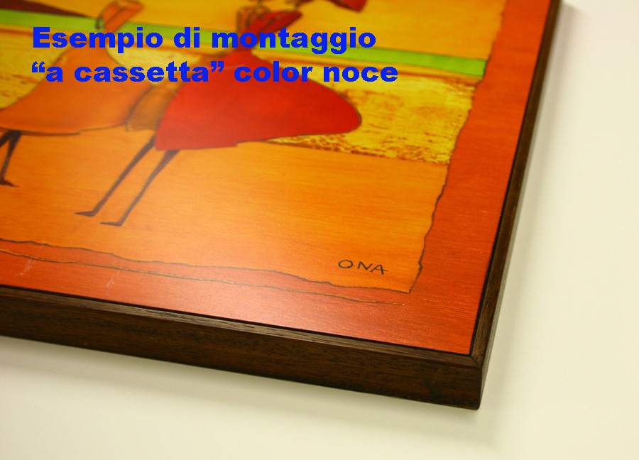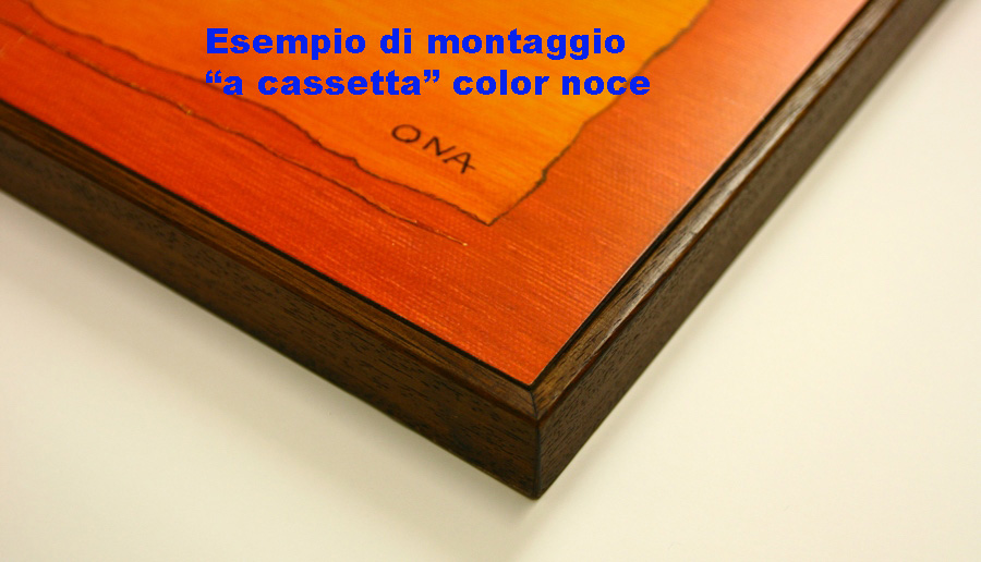 Montaggio della carta murale su pannello SMALL in legno color nero o noce (indicare la preferenza del colore nelle note a completamento dell'ordine). Finitura dell'incorniciatura cosiddetta a cassetta. Il pannello SMALL si adatta alle carte di larghezza fino a 140 cm.