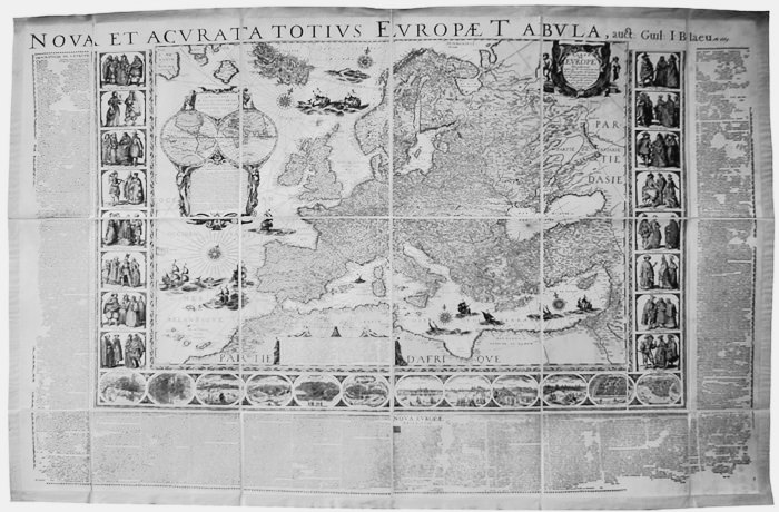 "La stamperia dei Blaeu è famosa soprattutto per la pubblicazione nel 1669 di quattro grandi carte murali che riproducono l’Europa, l’America, l’Asia e l’Africa. Di squisita fattura e rara bellezza queste carte si distinguono per la ricchezza dei cartigli e la finezza dell’incisione. Misurano ognuna circa metri 1,20 per metri 1,70 e sono realizzate con una tecnica uniforme che le appaia le une alle altre. Nei lati destro e sinistro di ognuna sono incise, otto per parte, sedici raffigurazioni di soggetti rappresentanti le popolazioni locali. Il lato meridionale contiene dodici vedute di città e all’esterno della cornice ricorre una descrizione geografica del continente delineato. Sull’area raffigurante i continenti sono, fra i particolari geografici, intercalate figure di tipi umani locali o di fauna, che animano vivacemente la planimetria. Sulle distese oceaniche si ripetono, molteplici, i motivi consueti di deità marine, di pesci fantastici, di battelli avventurosi. Il tutto, fuso in un notevole complesso decorativo, trasforma queste quattro carte in veri quadri di indubbio interesse sia storico che artistico. Questa carta, in analogia con le tecniche costruttive di un tempo, è costituita da più fogli (di carta di cotone) montati 'a stacchi' su tela. Tutto ciò al fine di migliorarne la conservazione, agevolarne la leggibilità e facilitarne il trasporto. I singoli fogli sono realizzati mediante l'incisione al torchio manuale della matrice in rame; questa pregevole realizzazione conferisce al disegno il caratteristico 'solco' percepibile al tatto."