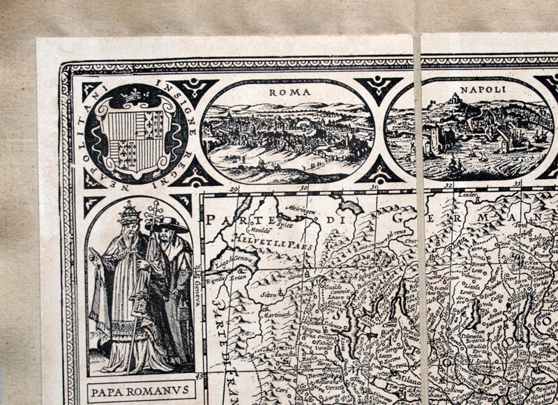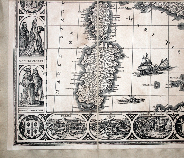 "Questa “Nova Italiae Delineatio”, opera di Iodocus Hondius (1563-1611) è stata definita bellissima dal punto di vista artistico, ed interessante per la sua relativa esattezza. E’ dedicata dall’autore alla Repubblica Veneta ed è munita di due scale: Miliaria Italica communia e Miliaria Germanica communia. Le raffigurazioni riportate ai margini della carta contribuiscono a trasformarla in un vero e proprio oggetto ornamentale. Questa carta, in analogia con le tecniche costruttive di un tempo, è costituita da più fogli (di carta di cotone) montati 'a stacchi' su tela. Tutto ciò al fine di migliorarne la conservazione, agevolarne la leggibilità e facilitarne il trasporto. I singoli fogli sono realizzati mediante l'incisione al torchio manuale della matrice in rame; questa pregevole realizzazione conferisce al disegno il caratteristico 'solco' percepibile al tatto."