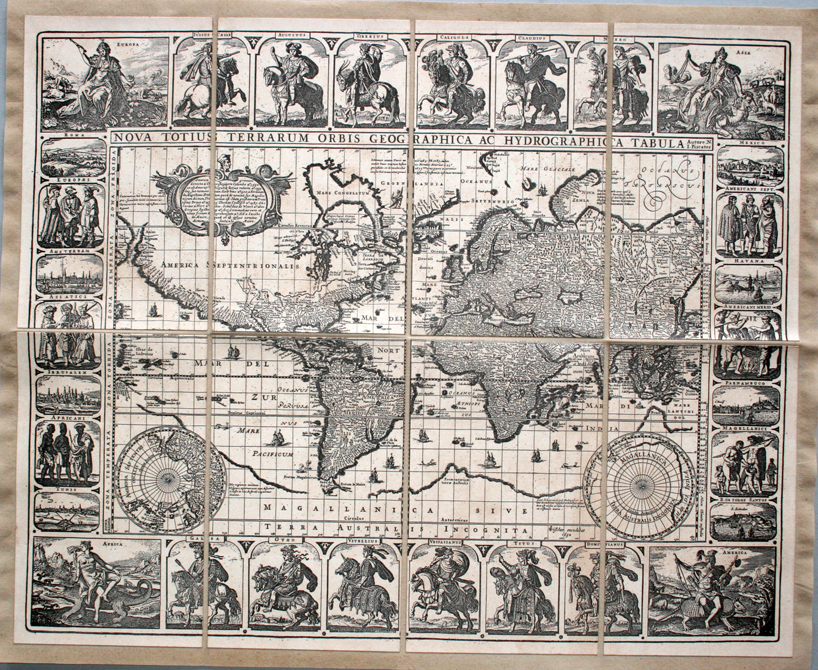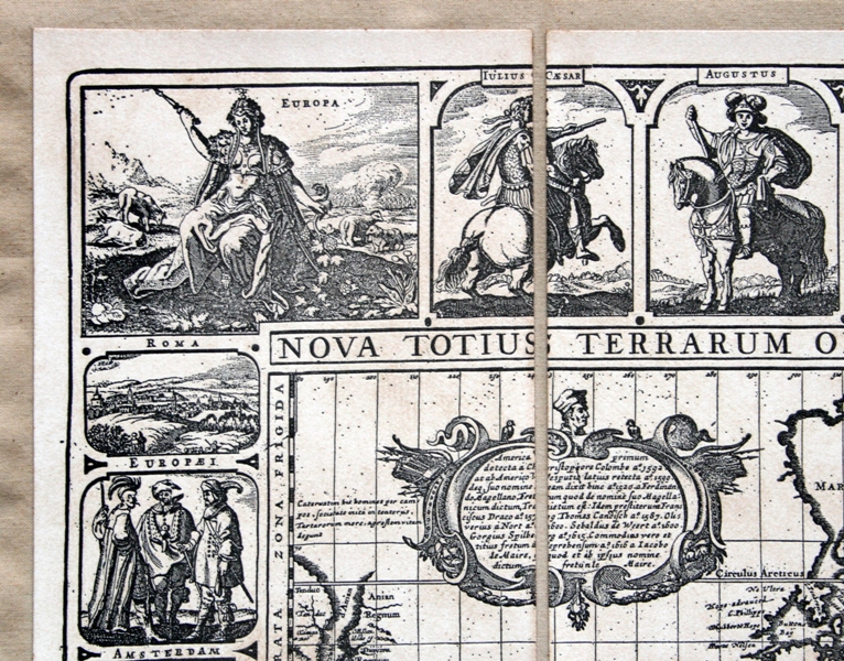 "Contrariamente a quanto si usava fare nel 1600 per descrivere l’intero mondo conosciuto (i due classici emisferi) o anche territori più delimitati, il Piscator ricorre ad una rappresentazione che si rifà a quella precedentemente introdotta nel campo cartografico dal famoso Mercatore e tuttora valida nella costruzione di carte navali, anche se, ovviamente, rivista e corretta. Il principio su cui si fonda la proiezione cilindrica isogona o conforme detta a latitudini crescenti di Mercatore è il seguente: stirare sulla carta gli archi di meridiano in un rapporto inversamente proporzionale all’accorciarsi sulla sfera degli archi di parallelo, quando si procede dall’Equatore verso i Poli. Ne risulta un reticolato in cui gli archi di meridiano sono sempre più lunghi verso le latitudini estreme e i paralleli quindi sempre più lontani tra di loro. Ai quattro angoli della carta sono disegnate altrettante figure allegoriche che rappresentano i quattro continenti, mentre sui margini sinistro e destro sono riportate vedute di città, intervallate da personaggi, nei loro caratteristici costumi. In alto ed in basso del planisfero sono invece disegnati una serie di imperatori romani. Questa carta, in analogia con le tecniche costruttive di un tempo, è costituita da più fogli (di carta di cotone) montati 'a stacchi' su tela. Tutto ciò al fine di migliorarne la conservazione, agevolarne la leggibilità e facilitarne il trasporto. I singoli fogli sono realizzati mediante l'incisione al torchio manuale della matrice in rame; questa pregevole realizzazione conferisce al disegno il caratteristico 'solco' percepibile al tatto. "