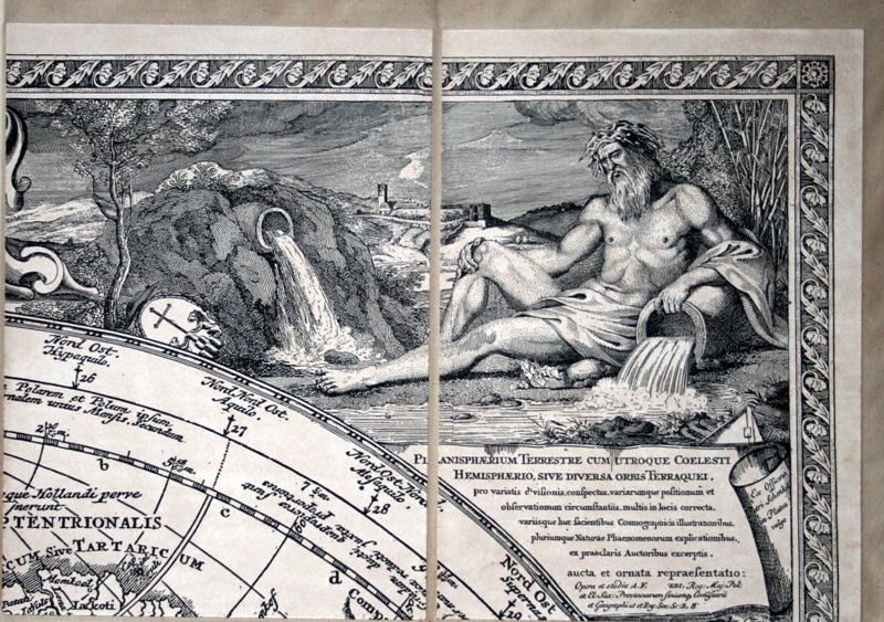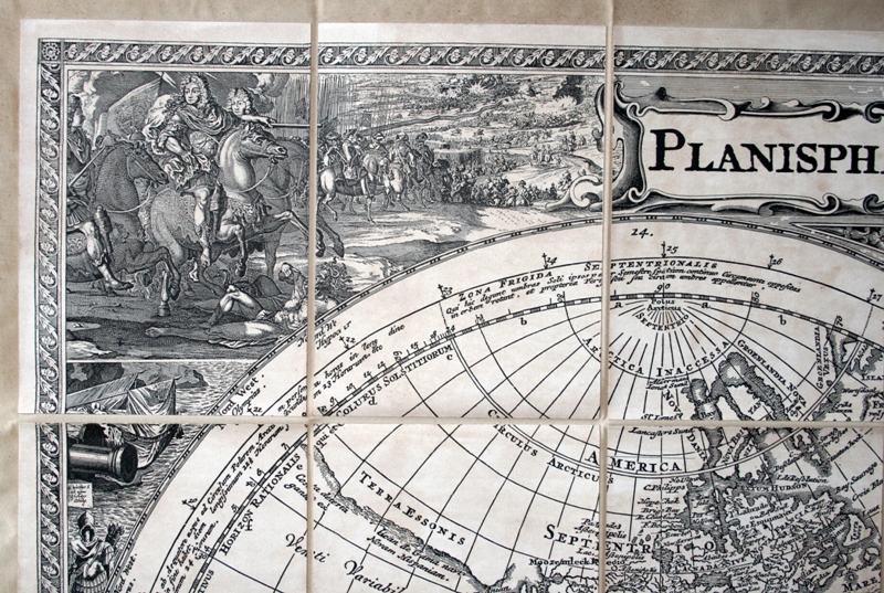 "Di dimensioni piuttosto ragguardevoli,questo planisfero colpisce per la raffinatezza del segno grafico, unita ad una armoniosa composizione dell'insieme. Nei quattro angoli della carta sono disegnati tipi di popoli situati in lontani paesi, di animali rari e di piante. Fra la Nuova Zelanda e lo stretto di Magellano è inserita una tabella delle distanze. Sotto a questa, nel lato sud, è riportata la sfera raffigurante il movimento degli Astri secondo l'Hypothesis Ptolemaica, seguita dalla carta del Polo Artico, dalla carta celeste e dalla carta del Polo Antartico; infine la Sfera con il movimento dei Pianeti secondo l'Hypothesis Tychonica. Questa carta, in analogia con le tecniche costruttive di un tempo, è costituita da più fogli (di carta di cotone) montati 'a stacchi' su tela. Tutto ciò al fine di migliorarne la conservazione, agevolarne la leggibilità e facilitarne il trasporto. I singoli fogli sono realizzati mediante l'incisione al torchio manuale della matrice in rame; questa pregevole realizzazione conferisce al disegno il caratteristico 'solco' percepibile al tatto."
