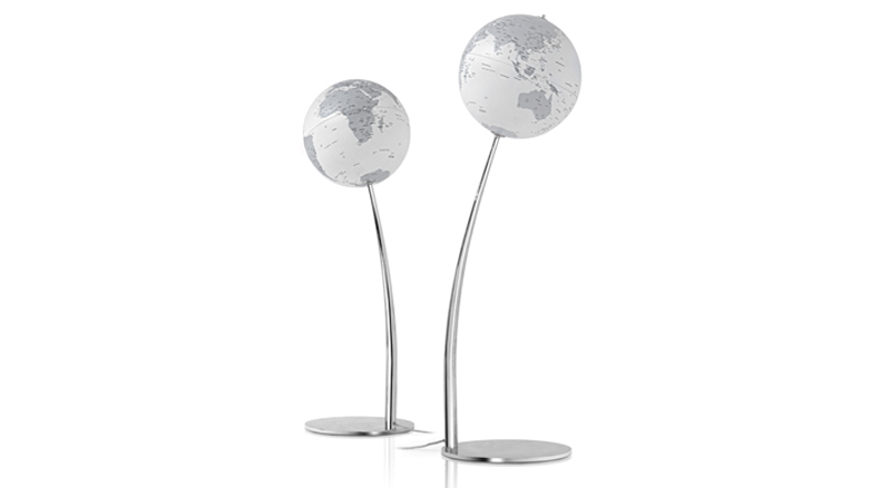Globo illuminato. Base in acciaio cromato. Cartografia bianca e grigia con codici telefonici internazionali e codici Internet. Designed by Atmoshere.