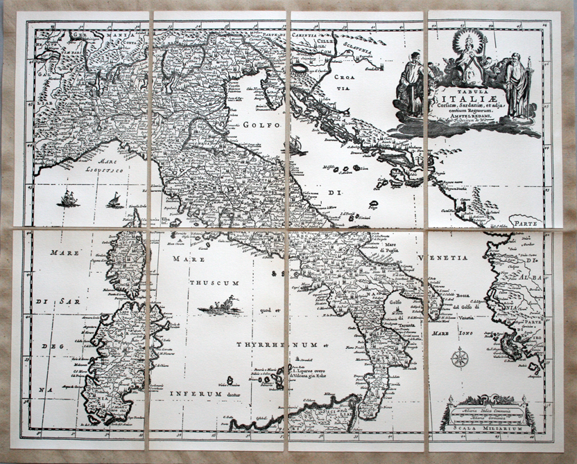 "Questa mappa dell’Italia è opera di Frederik De Wit (1616-1698), famoso editore e geografo olandese, autore di numerose carte ed atlanti. Fondò la sua casa editrice ad Amsterdam nel 1648. Dal 1670 al 1680 la ditta pubblica una serie di atlanti, tra cui quello del Belgio. Questa carta, in analogia con le tecniche costruttive di un tempo, è costituita da più fogli (di carta di cotone) montati 'a stacchi' su tela. Tutto ciò al fine di migliorarne la conservazione, agevolarne la leggibilità e facilitarne il trasporto. I singoli fogli sono realizzati mediante l'incisione al torchio manuale della matrice in rame; questa pregevole realizzazione conferisce al disegno il caratteristico 'solco' percepibile al tatto."