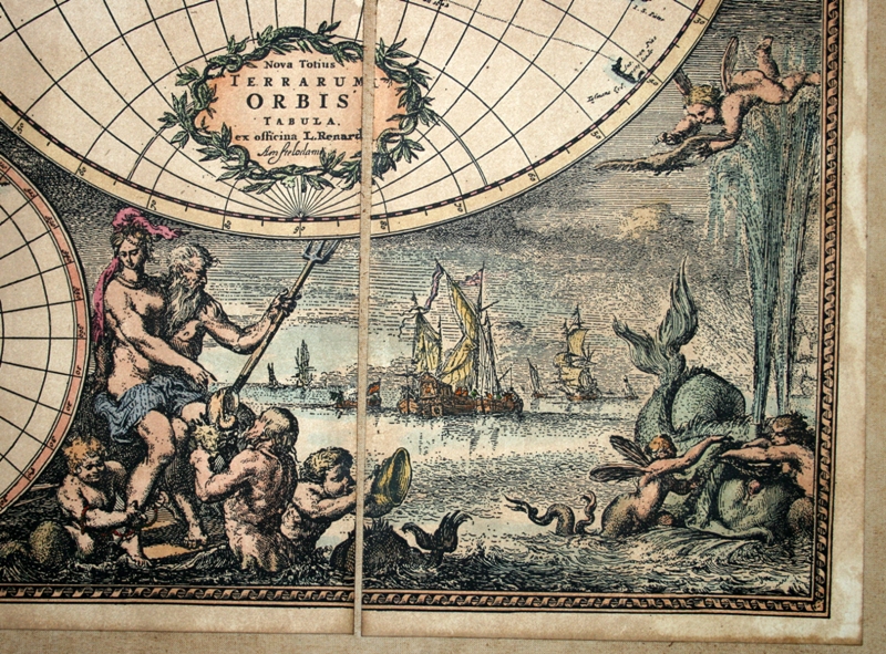 "Realizzato da La Feuille e stampato nelle officine Renard, questo planisfero colpisce per la raffinatezza del segno grafico unito ad una armoniosa composizione dell'insieme. Questa carta, in analogia con le tecniche costruttive di un tempo, è costituita da più fogli (di carta di cotone) montati 'a stacchi' su tela. Tutto ciò al fine di migliorarne la conservazione, agevolarne la leggibilità e facilitarne il trasporto. I singoli fogli sono realizzati mediante l'incisione al torchio manuale della matrice in rame; questa pregevole realizzazione conferisce al disegno il caratteristico 'solco' percepibile al tatto. Al processo di montaggio segue quello dell'acquerellatura, realizzata a mano, allo scopo di conferire al soggetto un gradevole effetto policromo. "