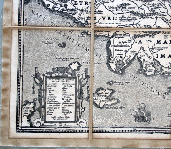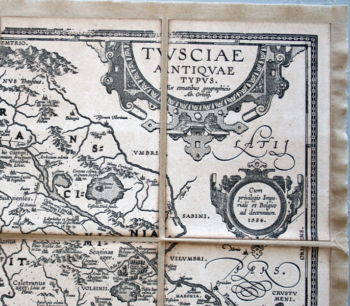 "Tipico intellettuale cinquecentesco, l’Ortelio è anche un viaggiatore curioso, un appassionato di antichità; in occasione della Fiera Internazionale di Francoforte sul Meno, nel 1554, acquista le sue prime carte geografiche, che applica poi su tela. E sempre in quella occasione fa la conoscenza di Gerardo Mercatore, più anziano di lui di 15 anni, già celebre per i suoi globi e le sue carte. Ed ecco che l’antiquario comincia a far posto al geografo: intuìto il vantaggio scientifico e commerciale legato alla elaborazione ed alla stampa di carte geografiche, pubblica nel 1564 la sua prima carta, la Typus Orbis Terrarum, incisa su rame. Successivamente realizzerà altre opere importanti, quali l’America, l’Asia (1567), e, soprattutto, l’atlante, il Theatrum Orbis Terrarum del 1570, le cui edizioni si susseguiranno durante la sua vita ed anche successivamente alla sua morte. Riproponiamo questa Tuscia del 1584, così com’era stata concepita e realizzata originariamente, così come il suo autore l’aveva pensata e commercializzata. Questa carta, in analogia con le tecniche costruttive di un tempo, è costituita da più fogli (di carta di cotone) montati 'a stacchi' su tela. Tutto ciò al fine di migliorarne la conservazione, agevolarne la leggibilità e facilitarne il trasporto. I singoli fogli sono realizzati mediante l'incisione al torchio manuale della matrice in rame; questa pregevole realizzazione conferisce al disegno il caratteristico 'solco' percepibile al tatto."