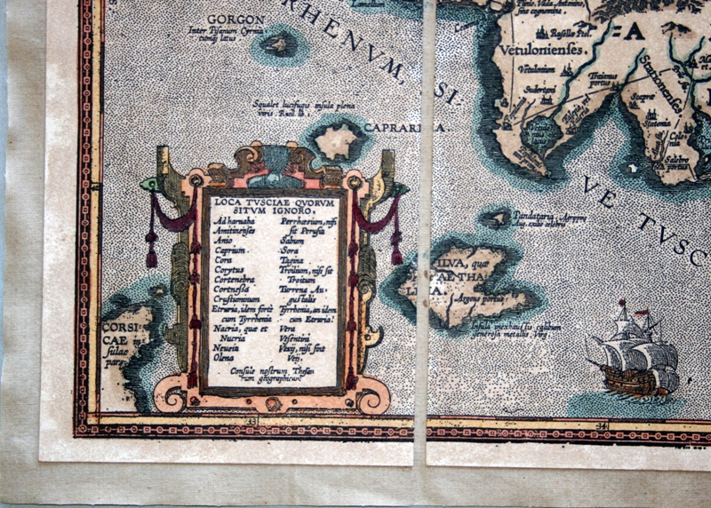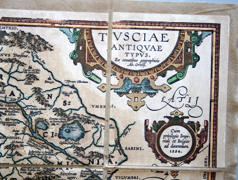 "Tipico intellettuale cinquecentesco, l’Ortelio è anche un viaggiatore curioso, un appassionato di antichità; in occasione della Fiera Internazionale di Francoforte sul Meno, nel 1554, acquista le sue prime carte geografiche, che applica poi su tela. E sempre in quella occasione fa la conoscenza di Gerardo Mercatore, più anziano di lui di 15 anni, già celebre per i suoi globi e le sue carte. Ed ecco che l’antiquario comincia a far posto al geografo: intuìto il vantaggio scientifico e commerciale legato alla elaborazione ed alla stampa di carte geografiche, pubblica nel 1564 la sua prima carta, la Typus Orbis Terrarum, incisa su rame. Successivamente realizzerà altre opere importanti, quali l’America, l’Asia (1567), e, soprattutto, l’atlante, il Theatrum Orbis Terrarum del 1570, le cui edizioni si susseguiranno durante la sua vita ed anche successivamente alla sua morte. Riproponiamo questa Tuscia del 1584, così com’era stata concepita e realizzata originariamente, così come il suo autore l’aveva pensata e commercializzata. Questa carta, in analogia con le tecniche costruttive di un tempo, è costituita da più fogli (di carta di cotone) montati 'a stacchi' su tela. Tutto ciò al fine di migliorarne la conservazione, agevolarne la leggibilità e facilitarne il trasporto. I singoli fogli sono realizzati mediante l'incisione al torchio manuale della matrice in rame; questa pregevole realizzazione conferisce al disegno il caratteristico 'solco' percepibile al tatto. Al processo di montaggio segue quello dell'acquerellatura, realizzata a mano, allo scopo di conferire al soggetto un gradevole effetto policromo. "